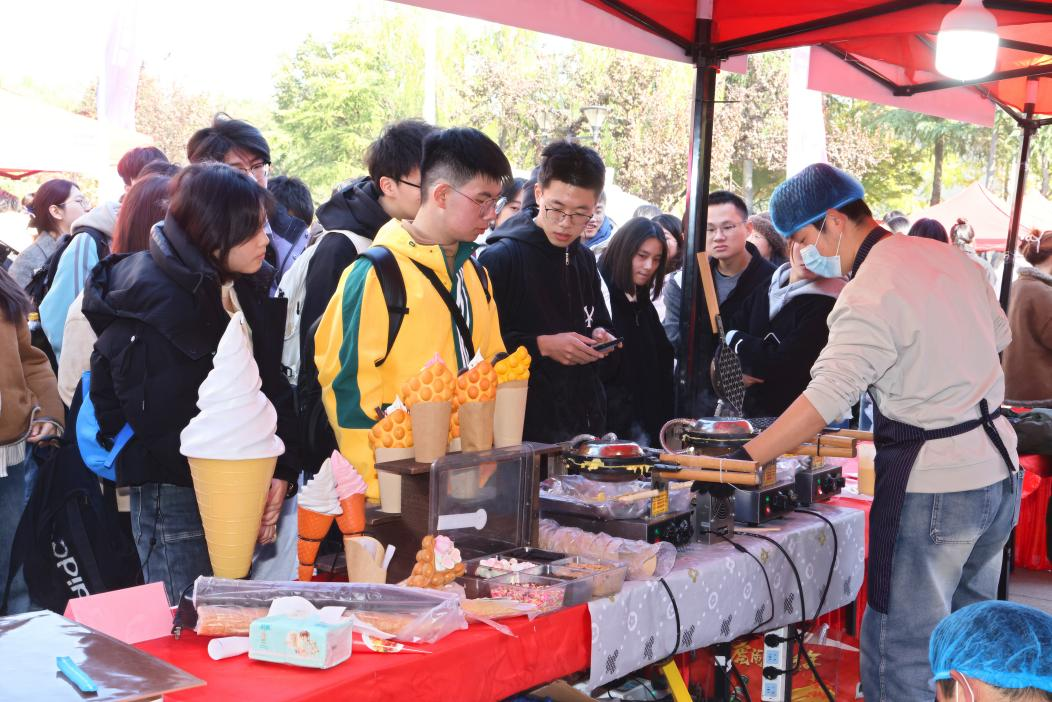 本届美食文化节在传承往届特色的基础上大胆创新,呈现出三大显著突破:其一,实现校区联动的全域覆盖,三大校区首次同步开启“美食狂欢”,让不同校区的师生共享“异地同味”的欢乐。其二,打造沉浸式美食体验场景,食雕艺术展区内,龙凤呈祥、江南水乡等主题的食雕作品惟妙惟肖,将“食”与“艺”完美融合,既彰显了厨师团队的精湛技艺,更传递出对美好生活的向往;“后勤学校厨艺课堂”人气爆棚,大盘鸡、皮带面、湘味小炒肉等特色菜品的烹饪教学,邀请师生亲身参与,在切菜、翻炒的互动中感受美食制作的乐趣与魅力。其三,推动烟火气与文化味深度融合,校园美食品鉴区以“美食一条街”形式全新呈现,学校各大食堂与合作餐饮企业携手“出摊”,1米超长烧烤肉串、外酥里嫩的缙云烧饼、料足味浓的爆蛋吐司等美食齐聚,既有跨越山海的异地佳肴,也有承载儿时记忆的家常味道,将浓浓的生活烟火气搬进了校园。与此同时,校企联名特惠专场带来本地特产、网红零食、时令蔬果等优质食材,各食堂推出的江南风味、蠡湖鲜味限量套餐,以及“非遗技艺大PK”“九毛爱心早餐套餐”等特色活动,全方位丰富了师生的美食体验。