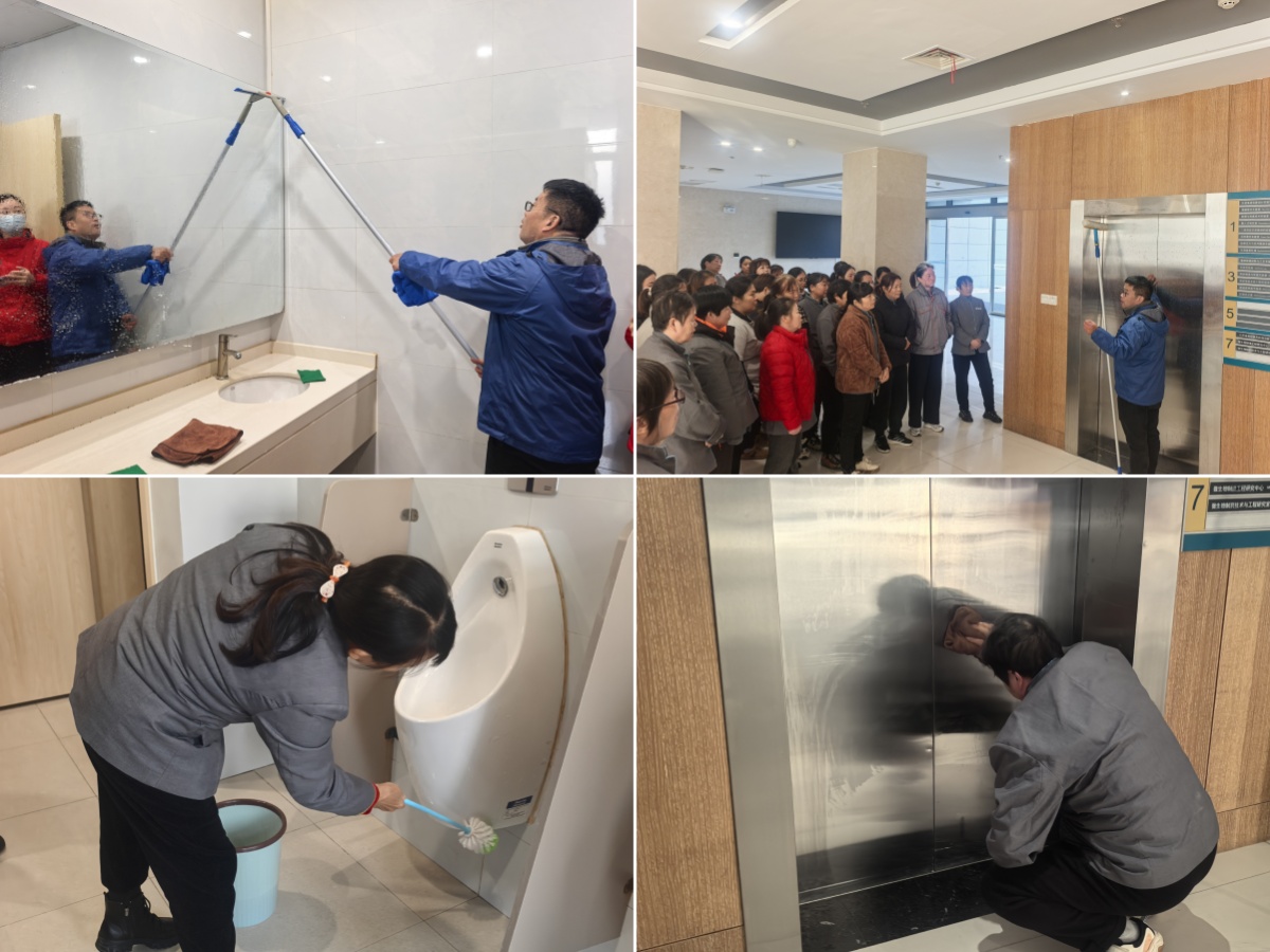 随后,沈志龙开启现场教学。他采用“理论讲解+实操示范”的方式重点讲解了卫生间清洁的关键环节,涵盖台盆与龙头的污垢处理、镜面亮洁技巧、小便池深度去污、五金件养护方法以及卫生死角的清理等内容,逐步拆解操作流程、强调规范细节。沈志龙还现场演示了电梯擦拭技巧,重点讲解如何在彻底清洁的同时,保持电梯轿厢光亮如新,兼顾实用效果与整体美观。