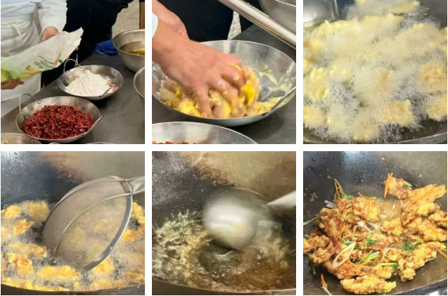 复旦大学厨师团队王国栋总厨现场教授锅包肉与辣子鸡两道经典菜肴的制作方法,这两道菜品也是复旦大学江湾校区食堂连续三年荣获“学生最喜爱菜品”称号的热门佳肴。王师傅首先阐释了两道菜的独特魅力,公布了其“黄金配比”,讲解了肉片确保外酥里嫩的小技巧。 辣子鸡则创新使用"三炸两炒"工艺,实现"辣而不燥,香而不腻"的口感平衡。王师傅在演示挂糊技巧的同时,向教师们阐释美食制作原理。将西餐精准控制理念融入中餐烹饪的教学模式,从事研究的王老师颇受启迪:“烹饪与做实验同理,变量控制决定最终成效。”